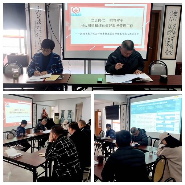 会议要求,2022年,所党委要按照“思想抓引领、制度抓落实、纪律抓执行、领导抓带头”的工作思路,强化“四个意识”,抓好“两个品牌”建设,全心打造“用心用情、精细精准”优质服务品牌,全力创建军休工作特色党建品牌,努力构建文明和谐军休长者家园。全体员工要以“我的岗位我负责,我的工作请放心”的责任和担当,真抓实干,用心用情精细化做好服务管理工作。