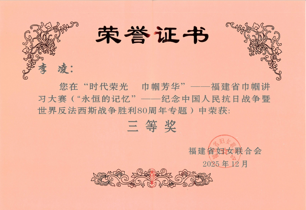 喜报!近日,“时代荣光 巾帼芳华”福建省巾帼讲习大赛圆满收官,我局巾帼宣讲员李凌凭借《烽火侨魂李林》作品,从全省191件作品中脱颖而出在“永恒的记忆”——纪念中国人民抗日战争暨世界反法西斯战争胜利80周年专题中荣获三等奖。